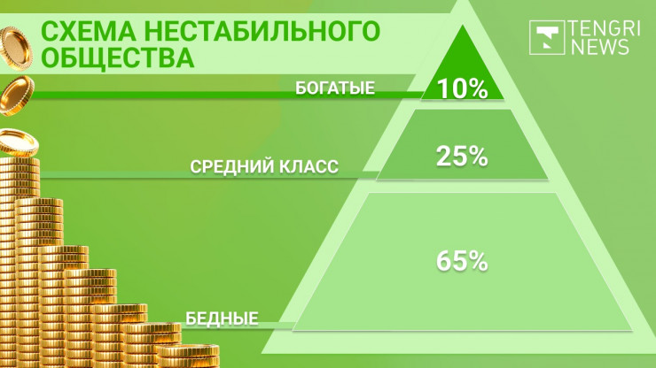 Эксперт Института мировой экономики и политики Алия Оразгалиева отмечает, что большинство классических социологических и экономических теорий делят общество на три больших класса - высший, средний и низший либо на богатых, зажиточных и бедных. Для наглядности обычно классы схематично изображаются в виде ромба или треугольника.