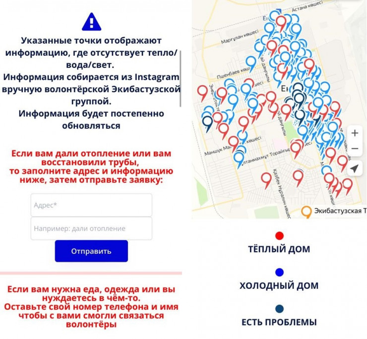 Из-за того, что волонтеры в момент ЧС буквально не успевали помочь всем, мы с друзьями создали сайт для приема заявок. Друг-айтишник из Экибастуза сейчас работает в Мексике, он сделал этот сайт. В реальном времени наши друзья в Астане сидели, мне информация приходила, я им передавал, и они на карте отмечали: где проблемный дом, где нет обогревателей, номера волонтеров. Снизу таблица с жалобами. Мы обзванивали людей, узнавали, что им нужно. Короче, подключились все, кто мог, из многих стран. Кто-то деньги скидывал. Мы проводили закупку и развозили необходимую помощь. После окончания режима ЧС работа сайта была остановлена.