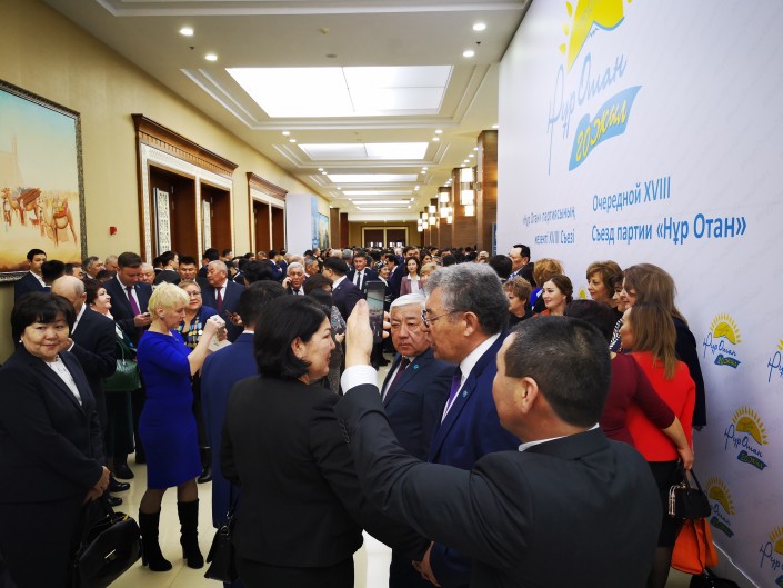 У делегатов съезда "Нур Отан" в распоряжении было более двух часов. Нурсултан Назарбаев должен был прибыть лишь к 11 утра. Ближе к 9:00 холл Дворца Независимости постепенно наполняли нуротановцы из всех регионов страны. Что они делали? А что еще делать празднично одетым людям? Конечно, фотографироваться. Нужно ли говорить, что в этот юбилейный съезд партии дамы были при параде, да и мужчины были под стать им. Не пропадать же такой красоте.