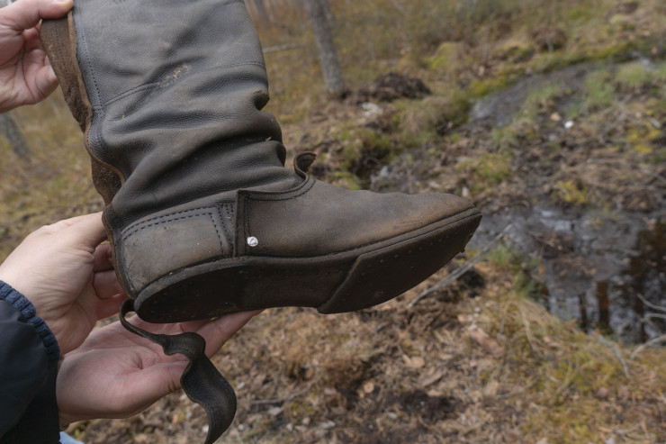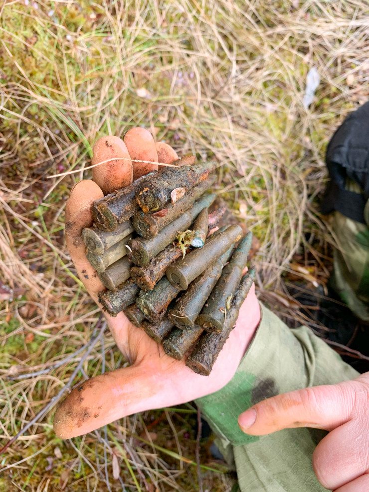 Металлоискатель издает характерный звук, поисковики начинают копать и находят останки солдат, много сохранившихся сапог, противогазов и фрагментов вооружения.
