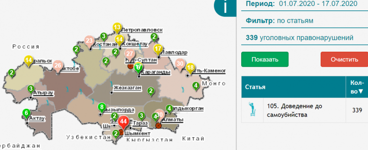 P. S. Отметим, что с 19 марта по 7 июля 2019 года было зарегистрировано 17 случаев доведения до самоубийства. Такие данные обозначены на Карте преступности. Согласно ответу Комитета по правовой статистике и специальным учетам Генпрокуратуры, на самом деле было зафиксировано 926 случаев, но по результатам досудебного расследования 809 дел были прекращены в связи с отсутствием состава или события преступления.