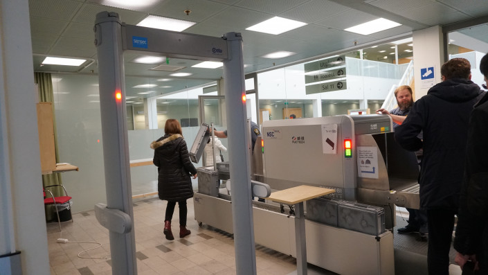 Прежде чем попасть в помещение, необходимо пройти контрольно-пропускной пункт. Такую процедуру проходят и в казахстанских судах.