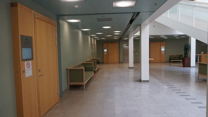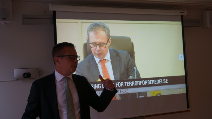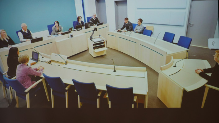 Поскольку в зале суда запрещена видео- и фотосъемка, судья Альм показал фото, на котором изображено заседание суда с участием присяжных. Примерно в такой обстановке рассматривается большинство дел в Швеции.