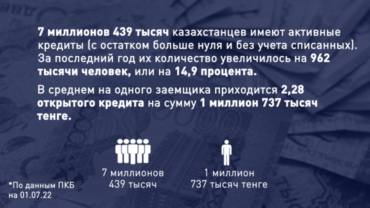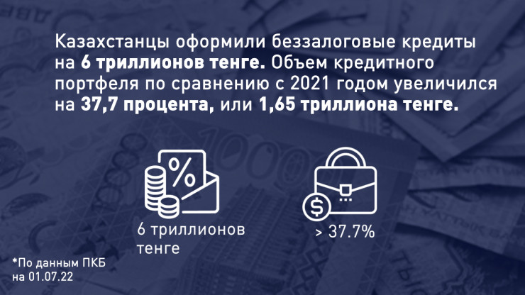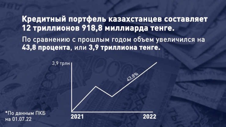 Кредитный портфель казахстанцев по состоянию на 1 июля составляет 12,9 триллиона тенге. В 2022 году казахстанцы стали чаще кредитоваться в сравнении с прошлым годом.