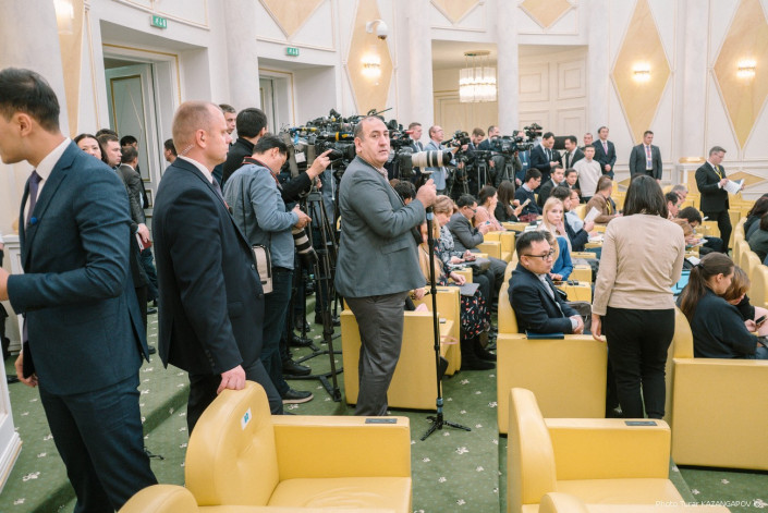 В этом зале сидят журналисты, они ждут, пока на экране начнется трансляция встречи двух президентов.