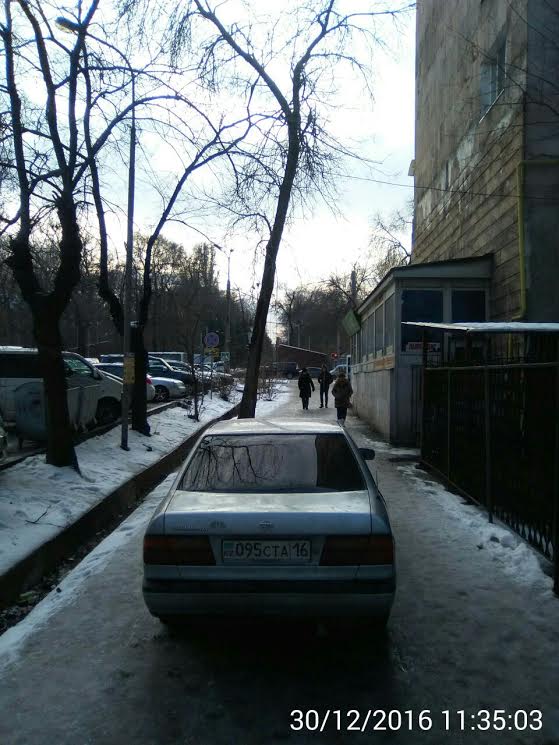 Еще одна жалоба на любителей парковаться в неположенных местах. Очевидец заснял Nissan Primera в районе улицы Гоголя и проспекта Достык, мешающий передвижению пешеходов, особенно людям с колясками.