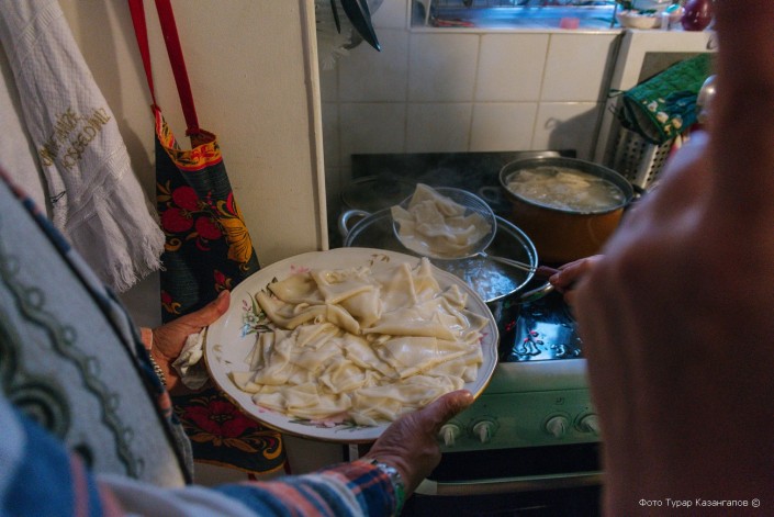 На кухне вовсю идут приготовления. На обед будет бешбармак.