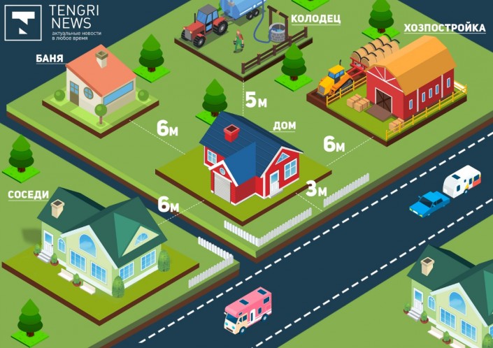"Согласно строительным нормам передний фасад дома должен находиться от границ участка на расстоянии шести метров, по бокам и сзади дома по три метра. Баня, времянка, гараж, сарай, все хозпостройки должны находиться на расстоянии шести метров от дома. Канализация от фундамента дома - минимум три метра, водопроводный колодец - от пяти метров", - рассказал директор проектной организации "ОТАНстройпроект" Нурлан Фазыл.