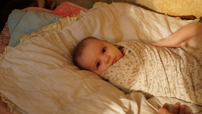 В соседней спаленке в этот момент просыпается самый младший ребенок в семье. Мать берет девочку на руки. Другие дети переключают внимание с телевизора на сестренку.