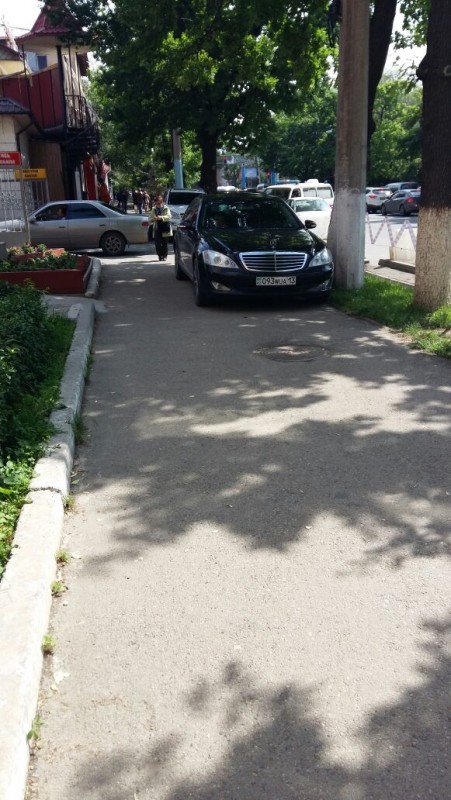 Водитель Mercedes в Алматы, также, по всей видимости, очень спешил и оставил своего железного коня прямо на тротуаре в районе улиц Жарокова, ниже Тимирязева.