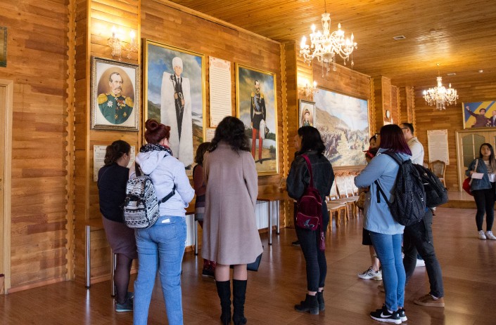 В рамках экскурсии особое внимание уделяется казакам, силами которых была построена станица. Чтобы водить экскурсии в Казачий культурный центр на Ашимбаева, 29, гиды предварительно специально договаривались с его руководством. В этом здании есть небольшой музей истории казачества, но в этот день он был закрыт по техническим причинам. Поэтому гостям удалось осмотреть только холл здания. Здесь на стене соседствуют портреты генерал-губернатора Верного Колпаковского, Первого Президента Казахстана Нурсултана Назарбаева (титул Почетного Верховного атамана казаков Казахстана он получил в 2006 году), а также последнего русского императора Николая II.