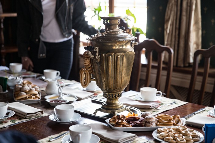 Чтобы дать отдохнуть уставшим гостям, их приглашают на чаепитие с самоваром в ресторан русской кухни на пересечении Казыбек би - Кунаева. Известно, что этот особняк принадлежал семье купца Федорова. Обстановка в доме не аутентична, интерьер создан современными дизайнерами. Но этот пит-стоп позволяет окончательно погрузиться в атмосферу того времени.