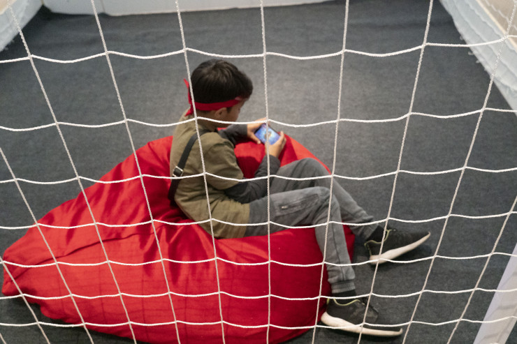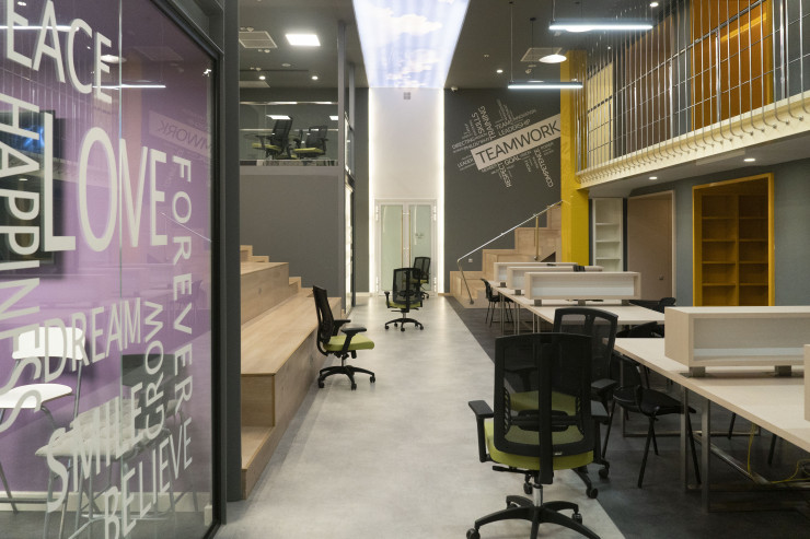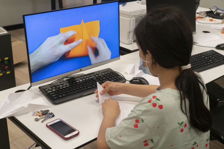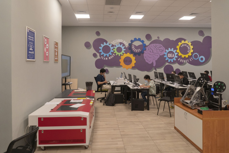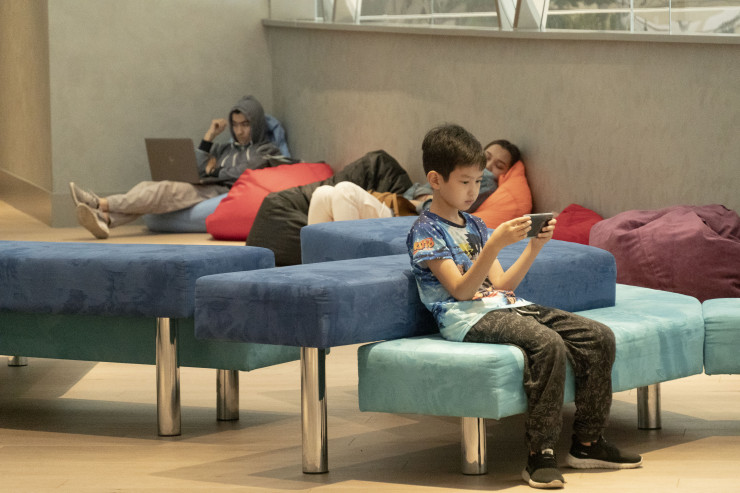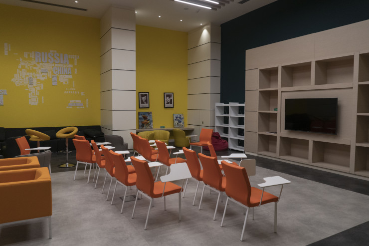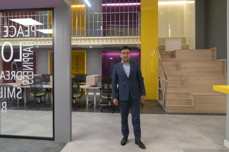 Оказавшись в огромном холле этого объекта, посетитель может быть сбит с толку: не сразу понятно, какой статус у этого здания: с одной стороны, это как бы продолжение охраняемого со всех сторон Назарбаев-центра, то есть по сути офиса Елбасы, с другой - все эти детские кружки, портрет Стива Джобса, кофейня, отдыхающие на раскиданных пуфах мальчишки и девчонки и яркий коворкинг с готовой студией для производства тик-ток-контента.
