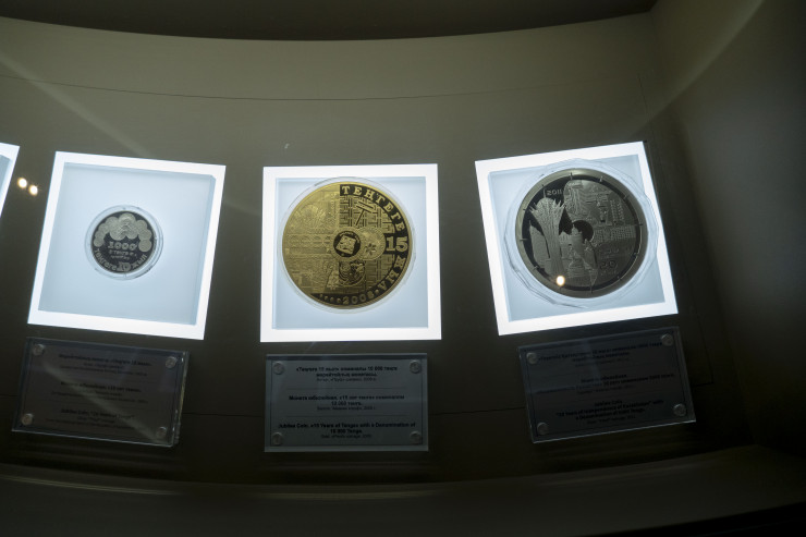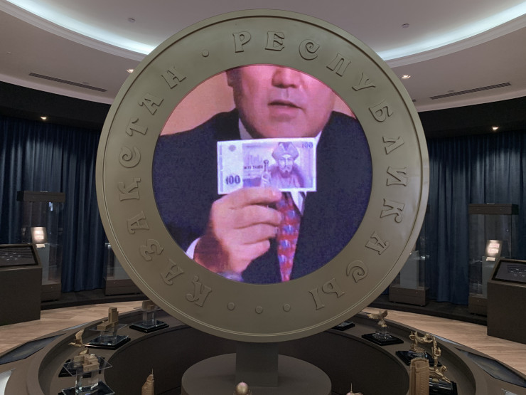 Музей этот буквально напичкан новыми технологиями - все здесь светится, вертится, издает звуки, а видео появляется, казалось бы, в самых неожиданных местах. Например, внутри гигантской монеты вдруг начинает проигрываться старый ролик, на котором Нурсултан Назарбаев демонстрирует казахстанцам первые тенге.