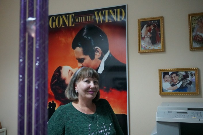 На стенах ее офиса с одной стороны плакат кинофильма "Унесенные ветром", с другой - картина, напоминающая работы художника и философа Николая Рериха.