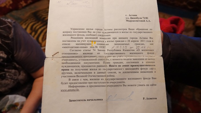 В 2011 году Мырзахметовы встали в очередь на социальное жилье. Тогда у них было пять детей и 10 287-е место в очереди. Спустя девять лет у них шесть детей и 5 544-е место. То есть получения жилья придется ждать еще девять лет.
