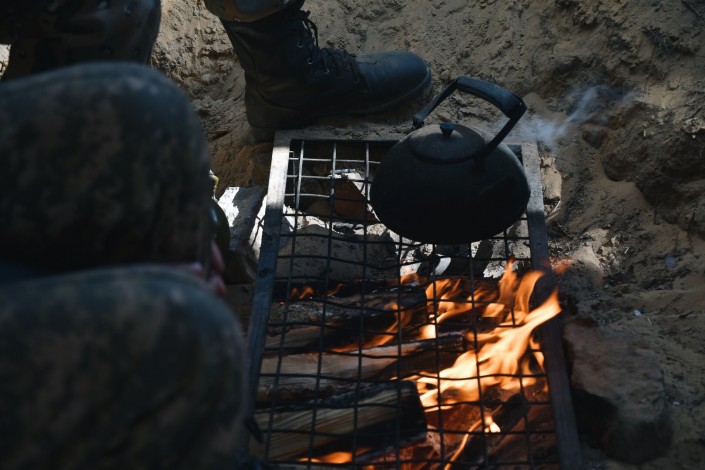 Беседу с Кусаиновым мы заканчиваем на полевой кухне. Здесь в специальном укрытии от дождя горит костер.