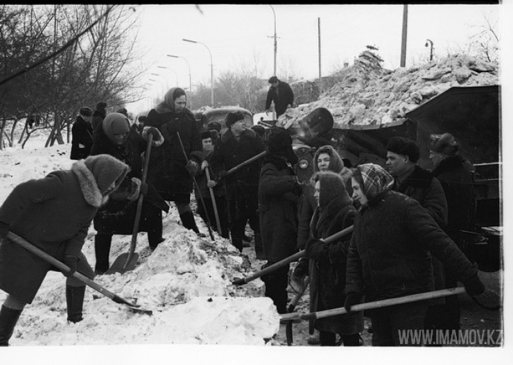 Февраль 1971-го. Как сейчас, так и тогда город нередко буквально утопал в снегу. Возможно, и в то время горожане ругали городскую администрацию за сугробы. Тем не менее были и субботники, как на следующих фото. Обратите внимание, что лопаты держат как мужчины, так и немало женщин.