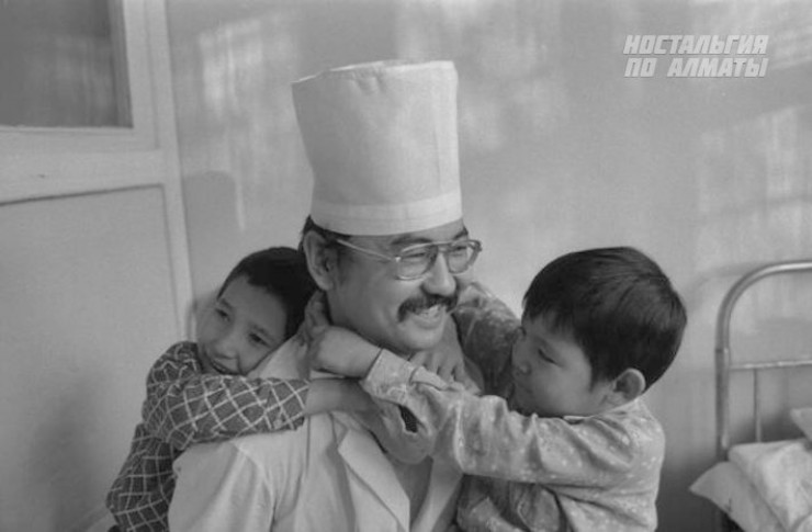 1983 год. Врач городской детской больницы № 1 Альбек Аюбаев с маленькими пациентами.