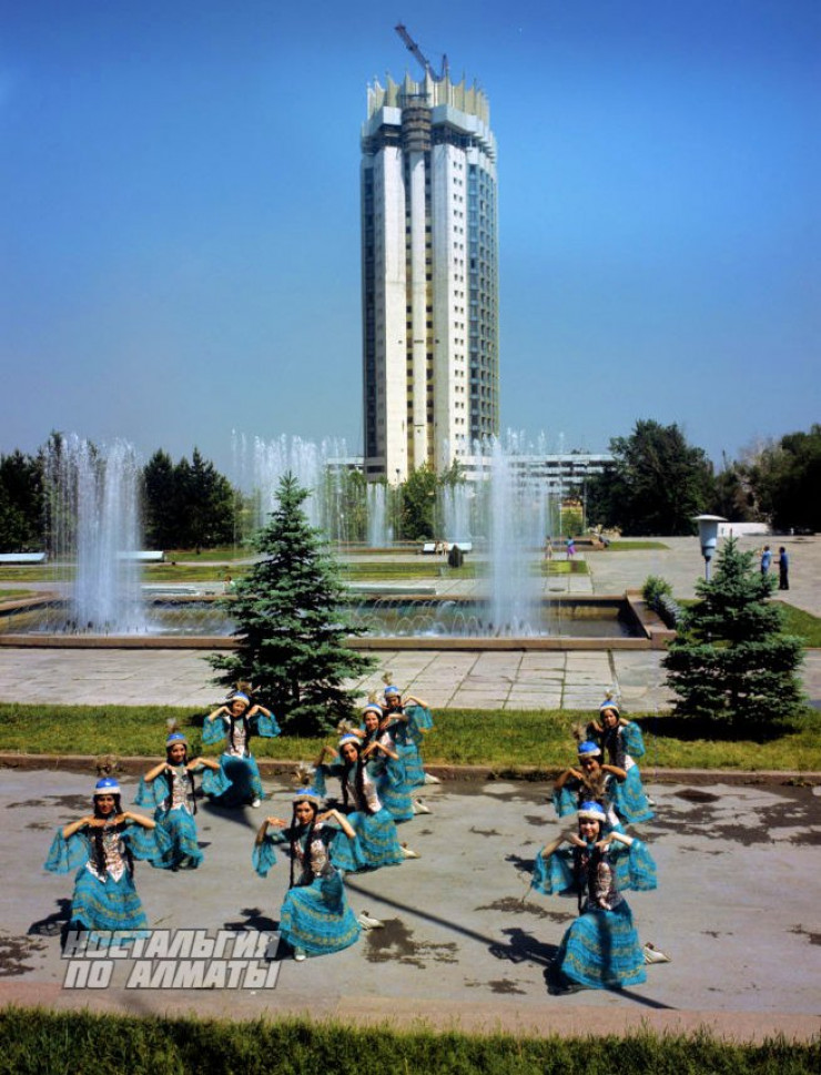 1977 год. Ансамбль "Гульдер" танцет на фоне фонтанов и почти достроенной гостиницы "Казахстан".