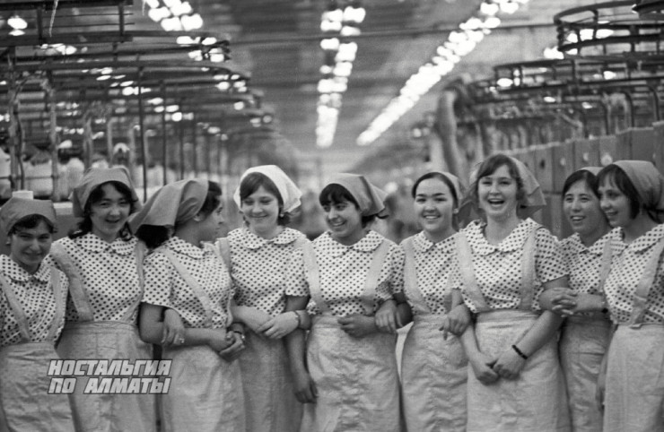 1976 год, работницы Алма-Атинского хлопчатобумажного комбината. По информации из открытых источников, АХБК выпускал ткани 13 артикулов, 7 из которых носили государственный знак качества. В 1981 году здесь был выпущен миллиардный метр натуральной ткани.