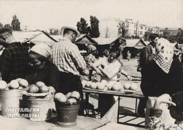 1972 год, Зеленый базар. На прилавках не дыни или большая картошка, как может показаться на первый взгляд. Это алматинские яблоки сорта "апорт".