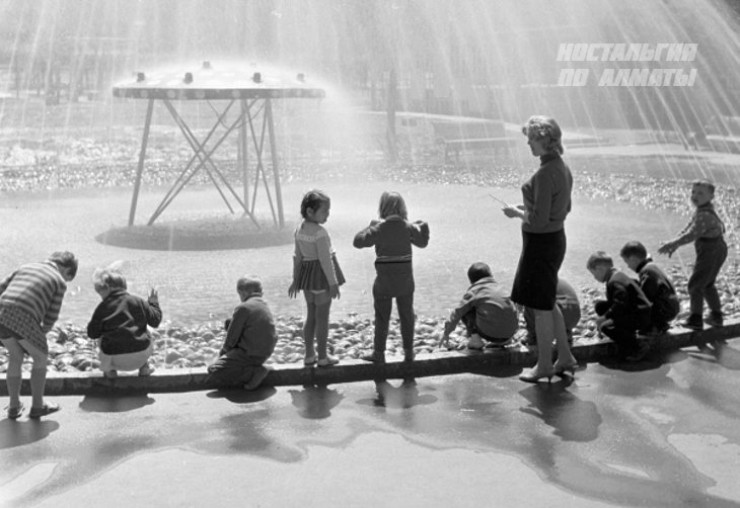 1966 год. Детсадовцы на прогулке у фонтана "Грибок" на пересечении улиц Фурманова - Джамбула.