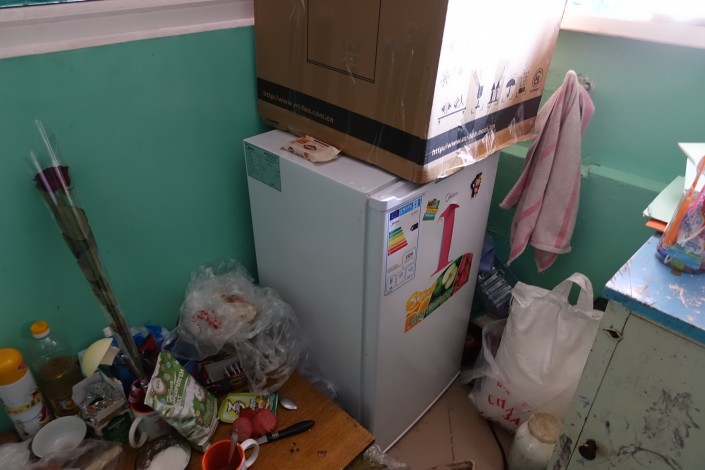 В углу маленькой комнаты стоит новый холодильник, который пожертвовал кто-то из добрых людей.