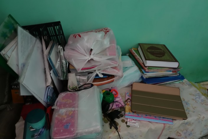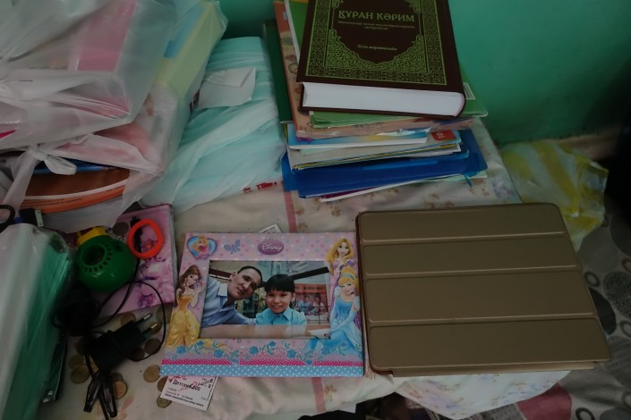 Пока посетителей в автомойке нет, дочь Исатая Инабат смотрит мультики и параллельно разглядывает акварельные краски и тетради, которые ей и ее старшему брату к началу учебного года привезли неравнодушные люди.