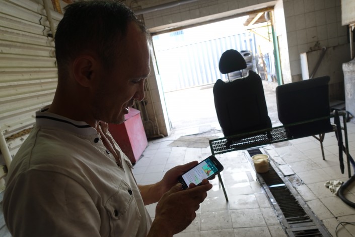 Исатай по прежнему работает на автомойке. Мы застали его за чисткой автомобильных кресел.