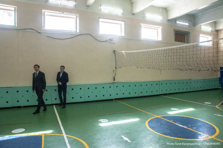 Возникли вопросы и по состоянию спортивного зала. Глава МОН в разговоре с директором подчеркивает, что некоторые вопросы, как, например, расположение сетки для спортивных игр, не нуждаются в помощи акимата или министерства.
