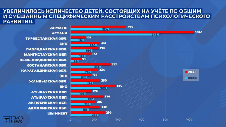 Согласно ответу Министерства здравоохранения на запрос редакции, в Казахстане на учете состоят 1914 детей с задержкой психоречевого развития. В ведомстве отметили, что наблюдают за ростом детей с общим и специфическим расстройством психологического развития.