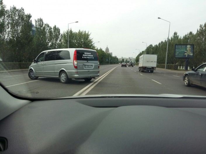 Еще одно нарушение правил дорожной разметки. "По проспекту Туран возле гостиницы "Думан" Mercedes-Benz Vito внаглую нарушил правила дорожного движения. Тем самым собрал сзади себя и без того не маленькую пробку", - рассказал очевидец.