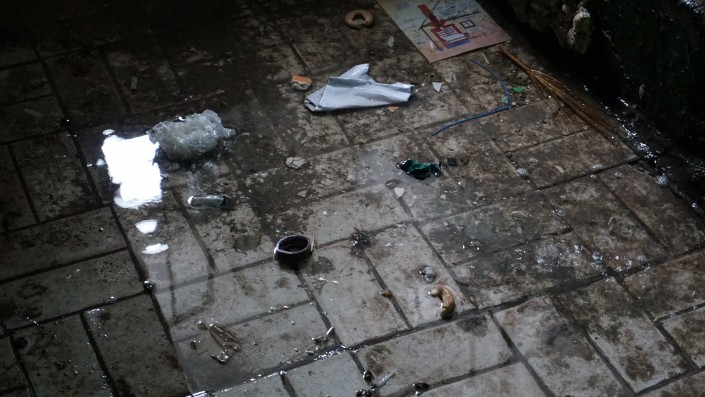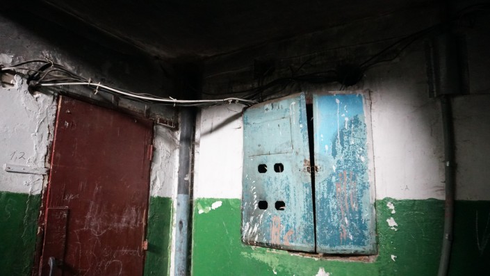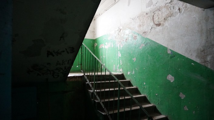 Так выглядят подъезды внутри. На первом этаже лужи, откуда-то сверху льется вода.