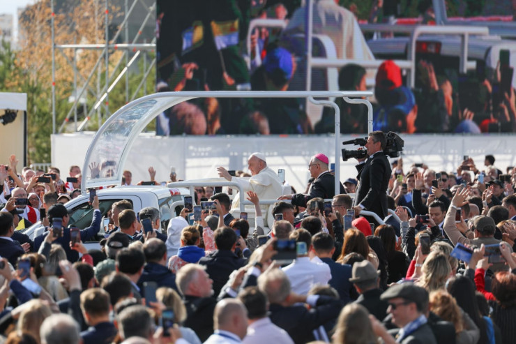 Перед богослужением Папа Римский Франциск проехал между рядами и поприветствовал присутствующих.