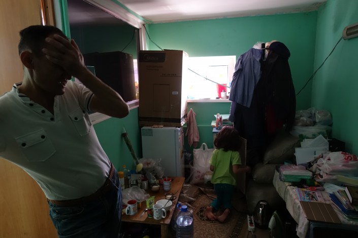 Исатай с сыном и дочерью в комнате на автомойке, 2019 год