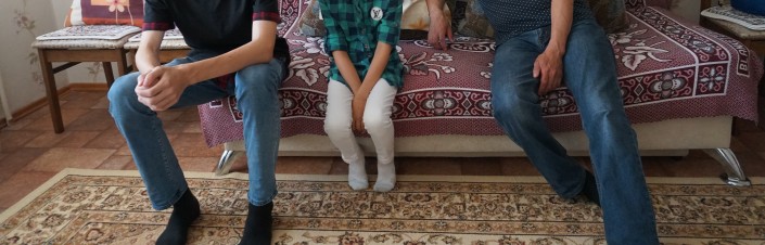 На фото Исатай с сыном и дочерью. Два года назад мы фотографировали их, но теперь они стараются избегать камеры и просят их не снимать. Повзрослели.