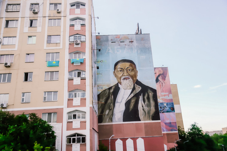 Вот еще один интересный мурал. Изображен на доме в районе улиц Абая-Момышулы.
