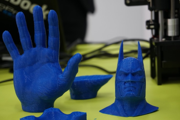 Маленький мальчик что-то печатает на 3D-принтере. Рядом с аппаратом уже лежат готовые вещи - пластиковые рука и голова Бэтмена.