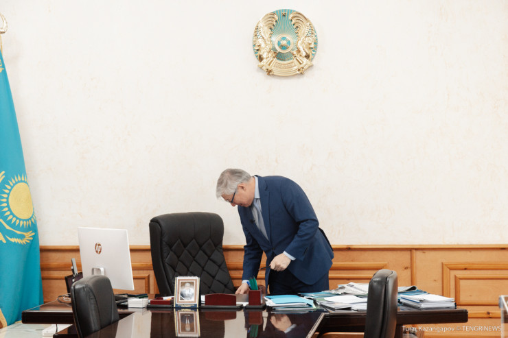 В кабинете акима мы не встретили висящего на стене портрета Президента. Небольшая фотография Касым-Жомарта Токаева в рамке стояла на его рабочем столе.