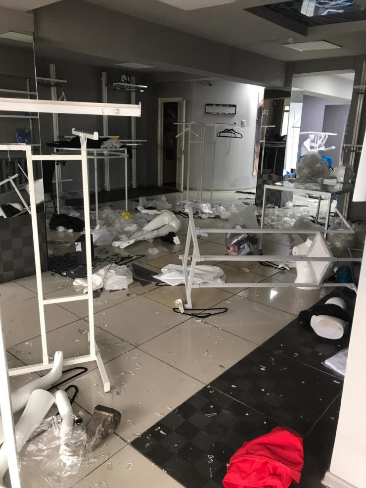 "Это была толпа непонятных, обкуренных, разъяренных мародеров. Видеонаблюдение было сорвано, но эти люди оставили улики - переобулись в нашу обувь, потому что мы продавали также кроссовки спортивные, а свою старую обувь оставили. Валялась термокружка, куртка, шапка. Флаг Казахстана в крови тоже оставили".