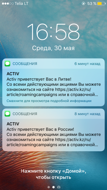 и где можно получить sms-сообщения от сотового оператора, что вы находитесь одновременно в двух странах - России и Литве.