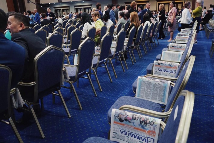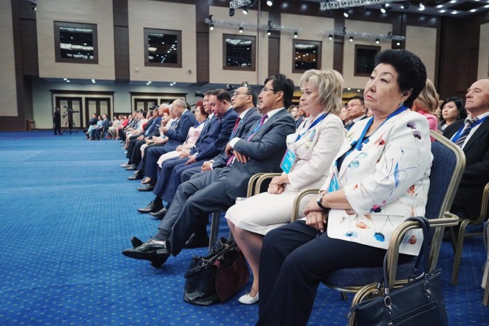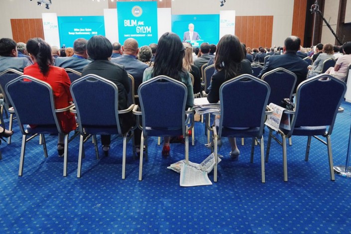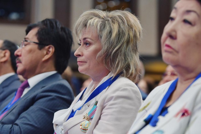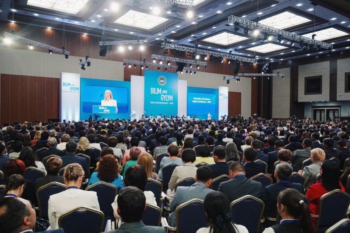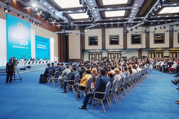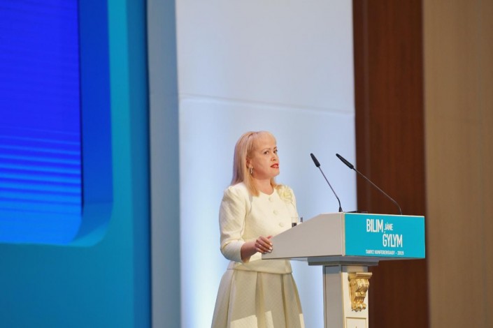 А вот она же в 2019-м, сидит на августовской конференции - главной встрече казахстанских педагогов.