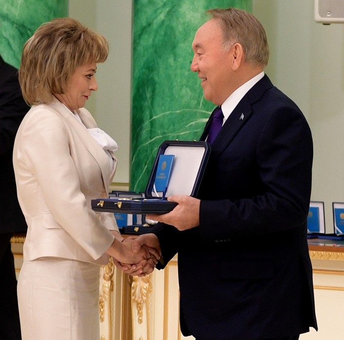 На этом фото - учитель шымкентской школы-гимназии № 1 имени Пушкина Алина Соловьева. В конце прошлого года она получила высокую награду от Нурсултана Назарбаева. Она стала обладателем высшей степени отличия - звания "Қазақстанның Еңбек Ері", то есть Герой Труда.