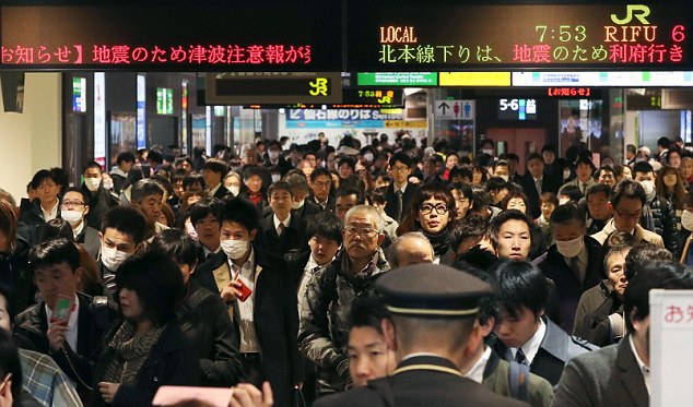 Пассажиры на станции "Сендай" в префектуре Мияги после сообщения об отмене поезда. © AP