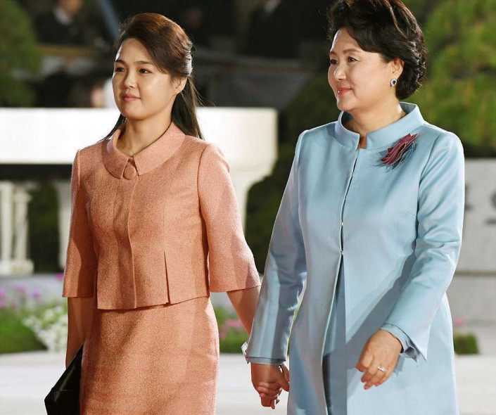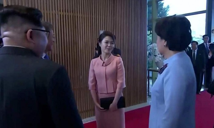 Жена лидера КНДР выбрала для встречи персиково-розовый костюм западного покроя. 62-летняя супруга южнокорейского президента была в голубом пальто, украшенном крупной фиолетовой брошью. Несмотря на недостаток опыта общения с иностранными лидерами, Ли Соль Чжу держалась свободно и уверенно.
