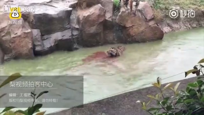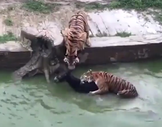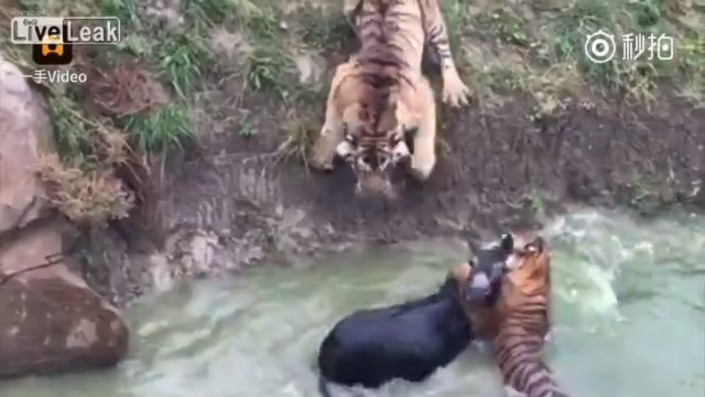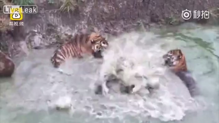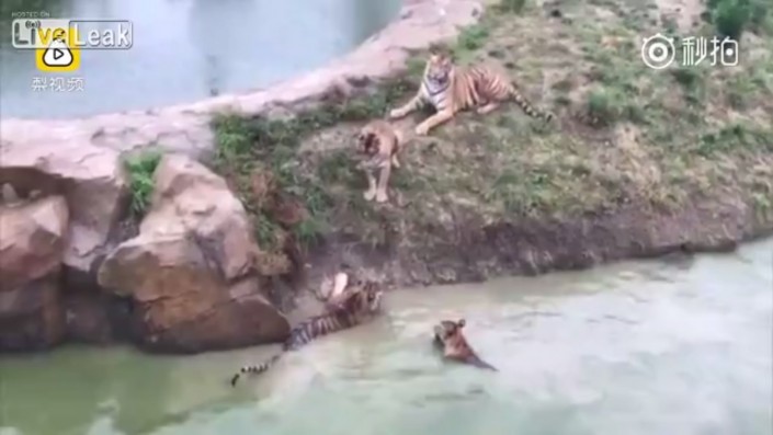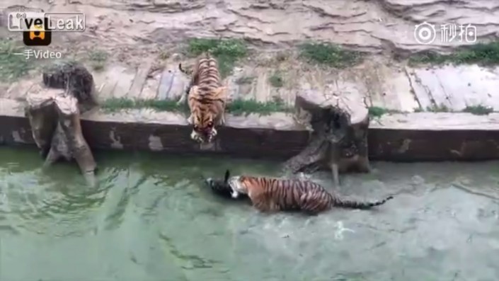 Перепуганное животное сбросили с высоты в водоем, где на него набросились хищники. На титрах видео, опубликованного порталом LiveLeaks, говорится, что тиграм понадобилось около получаса, чтобы убить добычу.