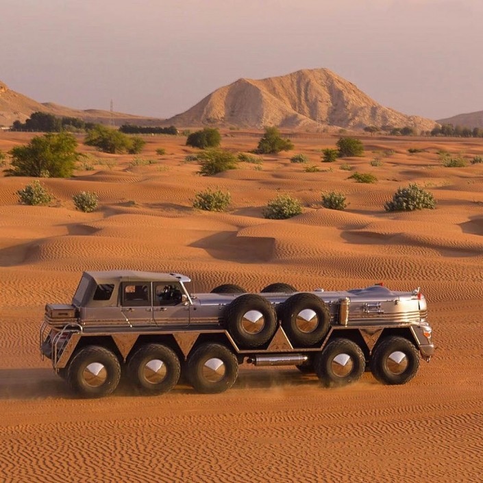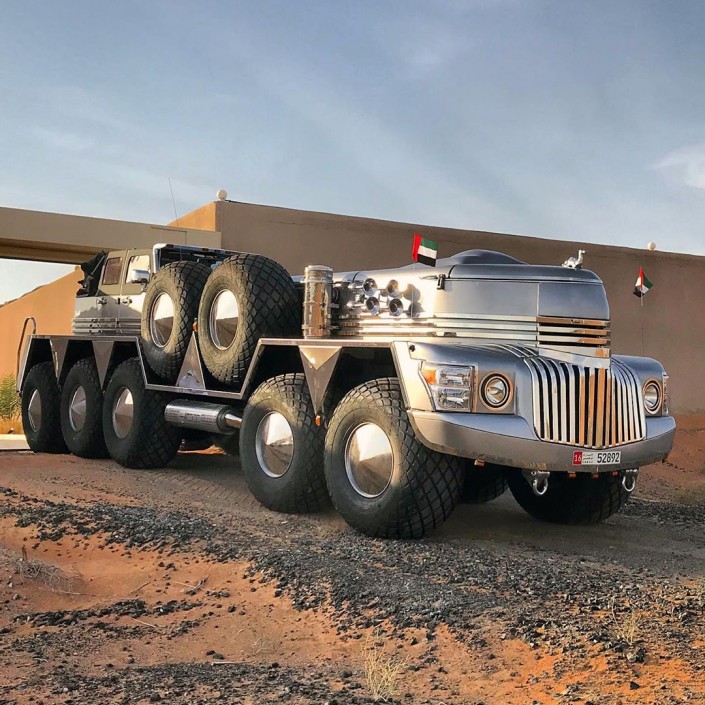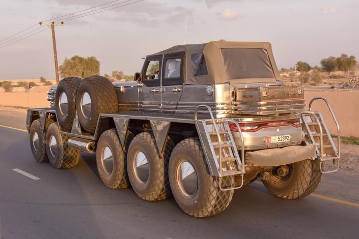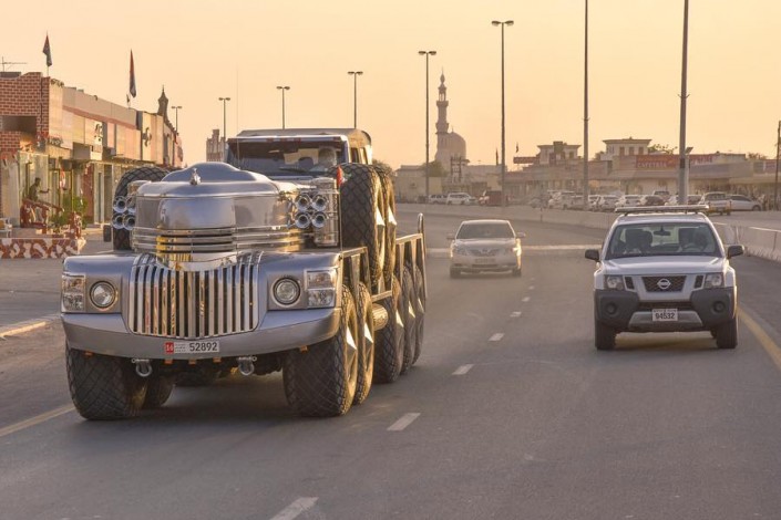 Передняя часть авто позаимствована у грузовика 40-х годов, кабина - у современного Jeep Wrangler Unlimited, фонари - у Ford Super Duty, а задний бампер - у Dodge Dart. Десятиколесный монстр получил имя Dhabiyan. Его ширина - 2,5 метра, высота - 3,2 метра.