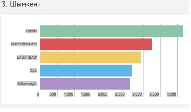 "Если вы думали, что лидером на "вторичке" в Шымкенте (более 28 тысяч регистраций) окажется Opel или Daewoo, вынуждены огорчить - это не так, по крайней мере в 2015 году. Больше всего перерегистраций значится опять же за Toyota (более 4,1 тысячи авто), на втором и третьем местах разместились марки Mercedes-Benz и Lada (ВАЗ) c результатом более 3,2 и 2,9 тысячи соответственно. Но Opel на юге действительно популярен - народной любви хватило, чтобы марка оказалась на четвертой строчке рейтинга популярности среди б/у", - пишет издание.