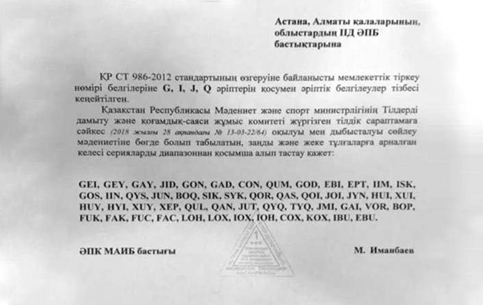 В Сети распространяется документ со списком сочетаний букв, которые на дорогах никогда не появятся. В него попали: GEI, GEY, GAY, JID, GON, GAD, CON, QUM, GOD, EBI, EPT, IIM, ISK, GOS, IIN, QYS, JUN, BOQ, SIK, SYK, QOR, QAS, QOI, JOI, JYN, HUI, XUI, HUY, HYI, XUY, XER, QUL, QAN, JUT, QYQ, TYQ, JMI, GAI, VOR, BOP, FUK, FAK, FUC, FAC, LOH, LOX, IOX, IOH, COX, KOX, IBU, EBU.